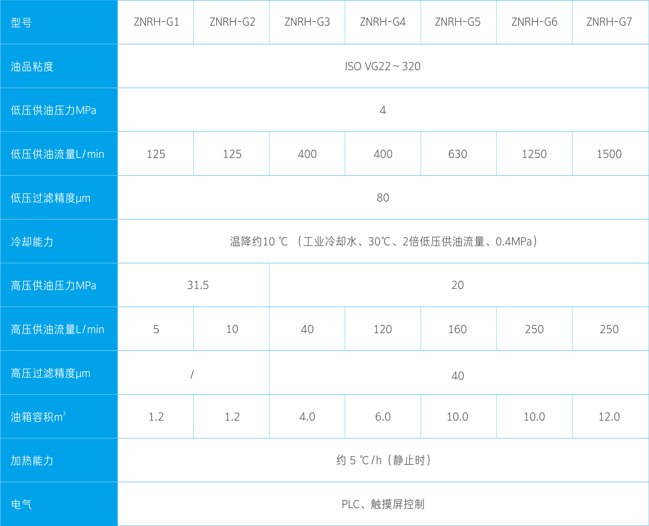 主要型號:znrh-G1(5/125 L/min) 、znrh-G2(10/125 L/min) 、znrh-G3(40/400 L/min) 、znrh-G4(120/400 L/min) 、znrh-G5(160/630 L/min) 、znrh-G6(250/1250 L/min) 、znrh-G7(250/1500 L/min)